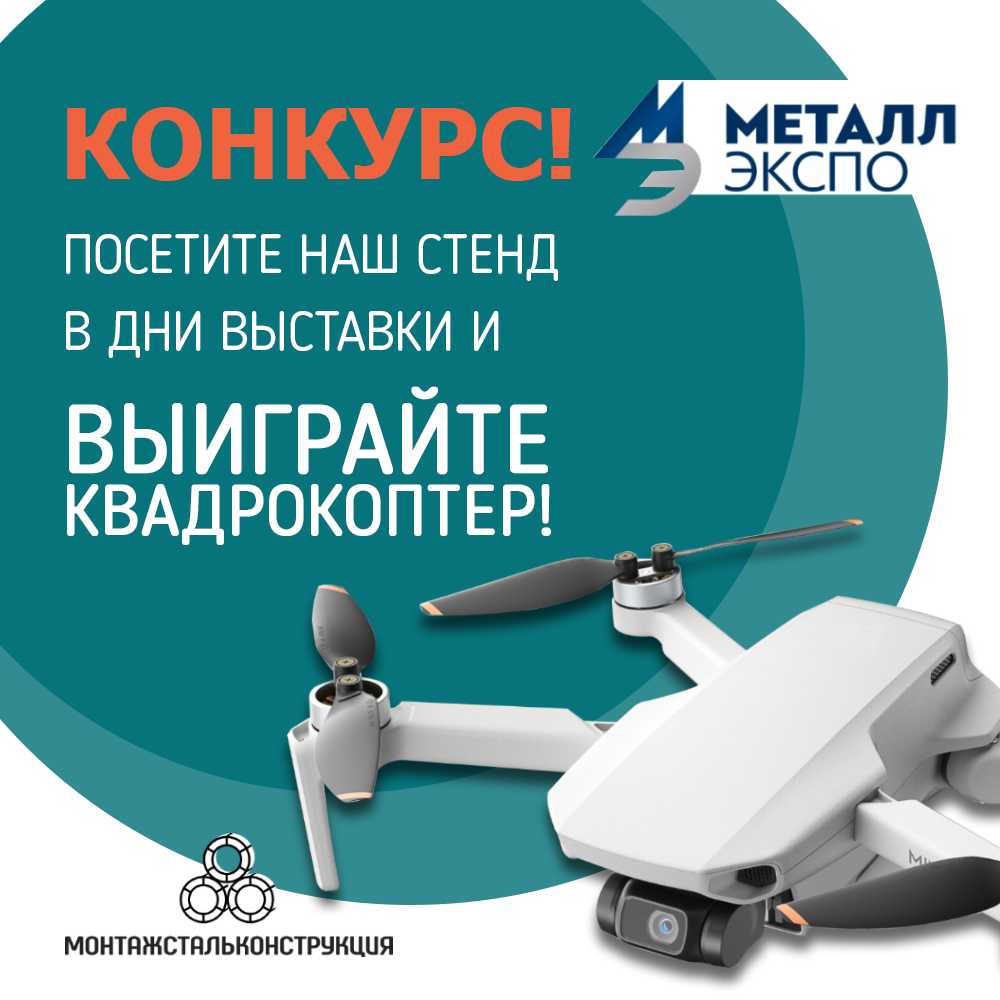 Выиграйте квадрокоптер для аэрофотосъемки от мирового лидера по производству дронов фирмы DJI и другие призы! Чтобы принять участие в нашем конкурсе необходимо в дни проведения выставки «Металл-Экспо 2021» посетить наш стенд в ЦВК«Экспоцентр» (павильон №8, зал2, Стенд № 82C04) и совершить следующие действия: 1. Сфотографироваться на фоне нашего стенда 2. Подписаться н...