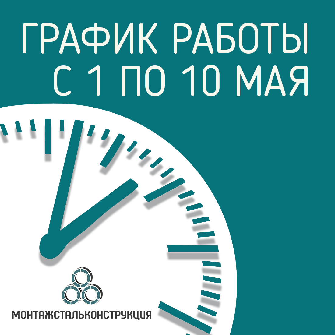 Компания Монтажстальконструкция заботится о своих клиентах и поэтому режим работы в праздничные дни следующий: 1,2,3 мая - ВЫХОДНЫЕ 4,5,6,7 мая - РАБОТАЕМ с 9:00 до 18:00 8,9,10 - ВЫХОДНЫЕ Далее работаем в обычном режиме.